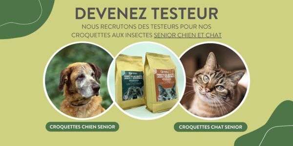 Si vous souhaitez découvrir nos croquettes aux insectes pour chats et chiens seniors, nous vous invitons à participer à notre panel testeur de 3 semaines ! Vous recevrez un questionnaire pour évaluer les résultats, ainsi que des croquettes pour la durée du test.